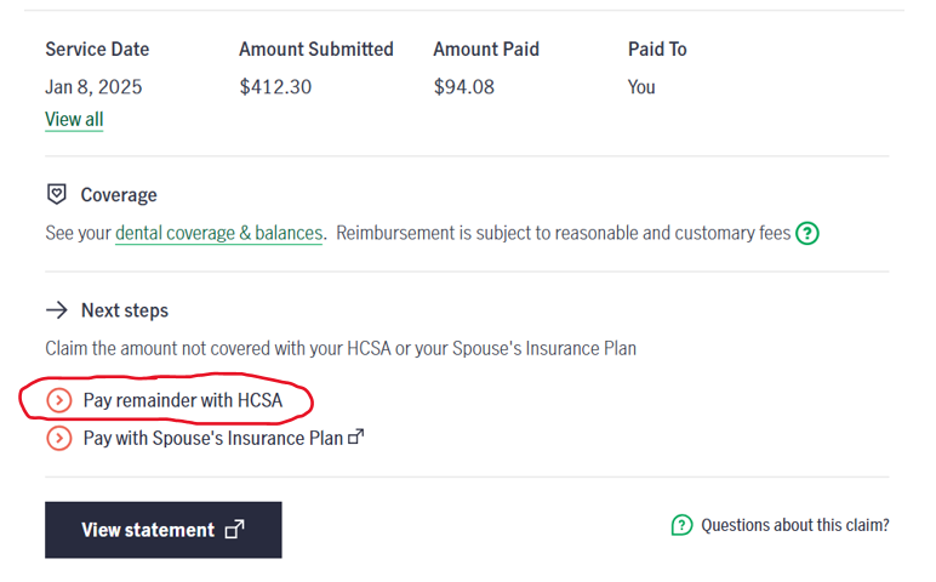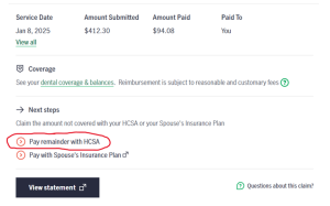 We have been advised that this button only works intermittently. If you don’t get a confirmation number or the claim isn’t paid within 5 to 7 working days, you will need to resubmit it under the Submit a Claim button and choose my Health Care Spending Account only