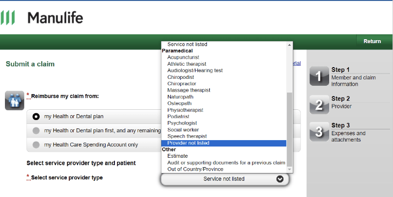 Some members have reported challenges with making a claim for professional services. The screen shot (below) shows the list to select the type of professional services provider accessed, but it is not complete.