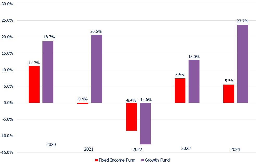 The return indicated on each member statement is a combination of the funds, based on that member’s balance in each, and the respective monthly earnings, less approximately 0.9% for plan expenses. Remember that assets in individual member accounts are allocated between these two funds based on the member’s age, so everyone will experience a slightly different combined return based on the allocation.